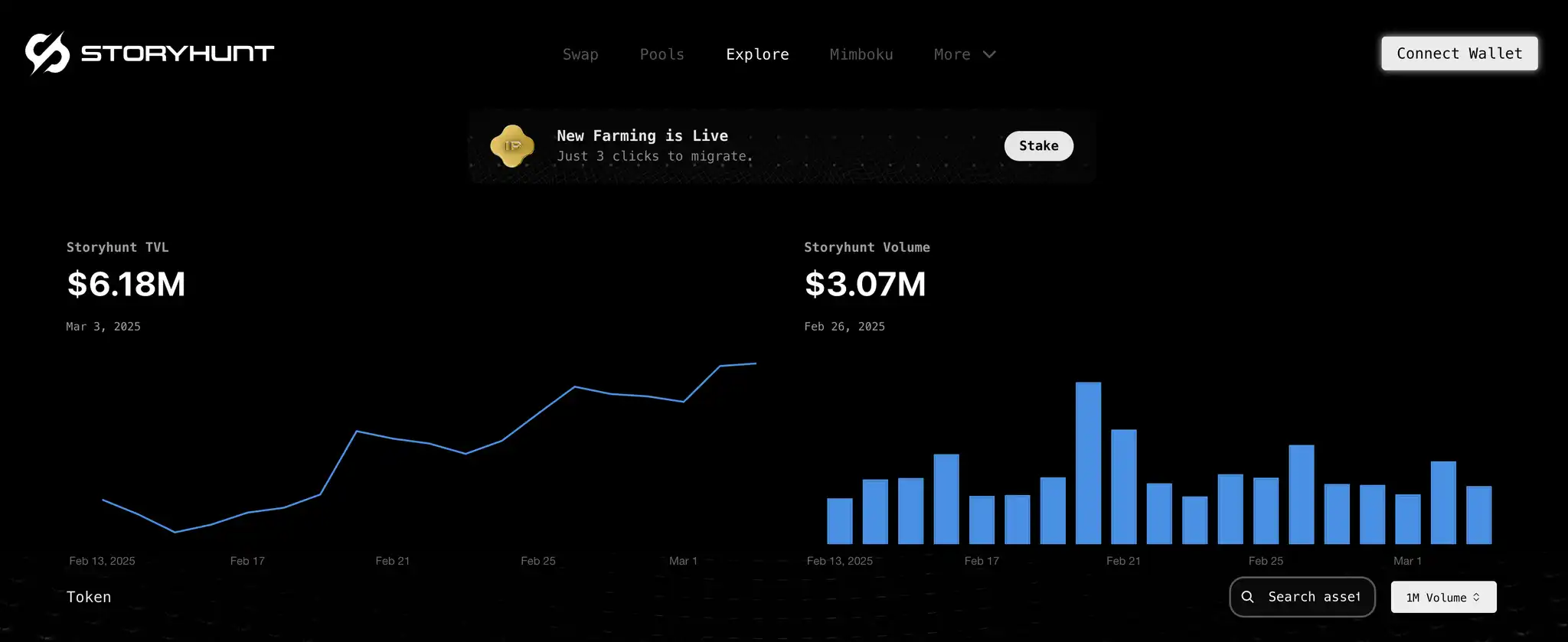 IP 的 DeFi 生态的可组合性大大的超出了传统 DeFi 的范畴。在这里你甚至可以将你的炙手可热的 IP 进行评估,并根据其未来一定时间能够产生的现金流,进行抵押借贷。IPFi 的来到更凸显了持有优质 IP 资产的重要性。因为掌握了优质的 IP 资产,就是掌握了优质的现金流。主网上线不到一个月的时间里。Story 链上的 DeFi 生态主要以原生 DEX,借贷平台,Staking/收益聚合,和衍生品几个板块构成。