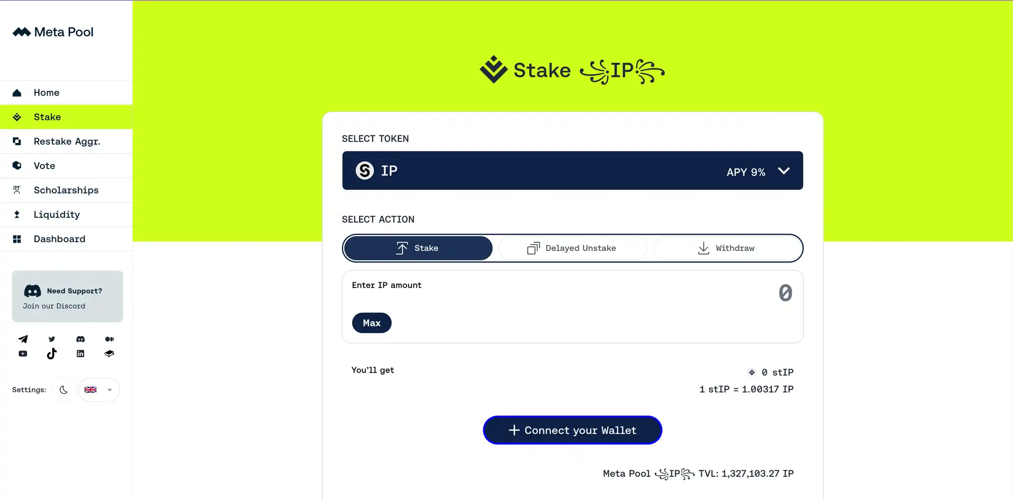 Metapool 专注于 STORY 代币的质押,当前质押 APY 为 9%,Metapool 质押池 TVL 为 1.3M $IP, 质押率占代币流通量的 0.6%。