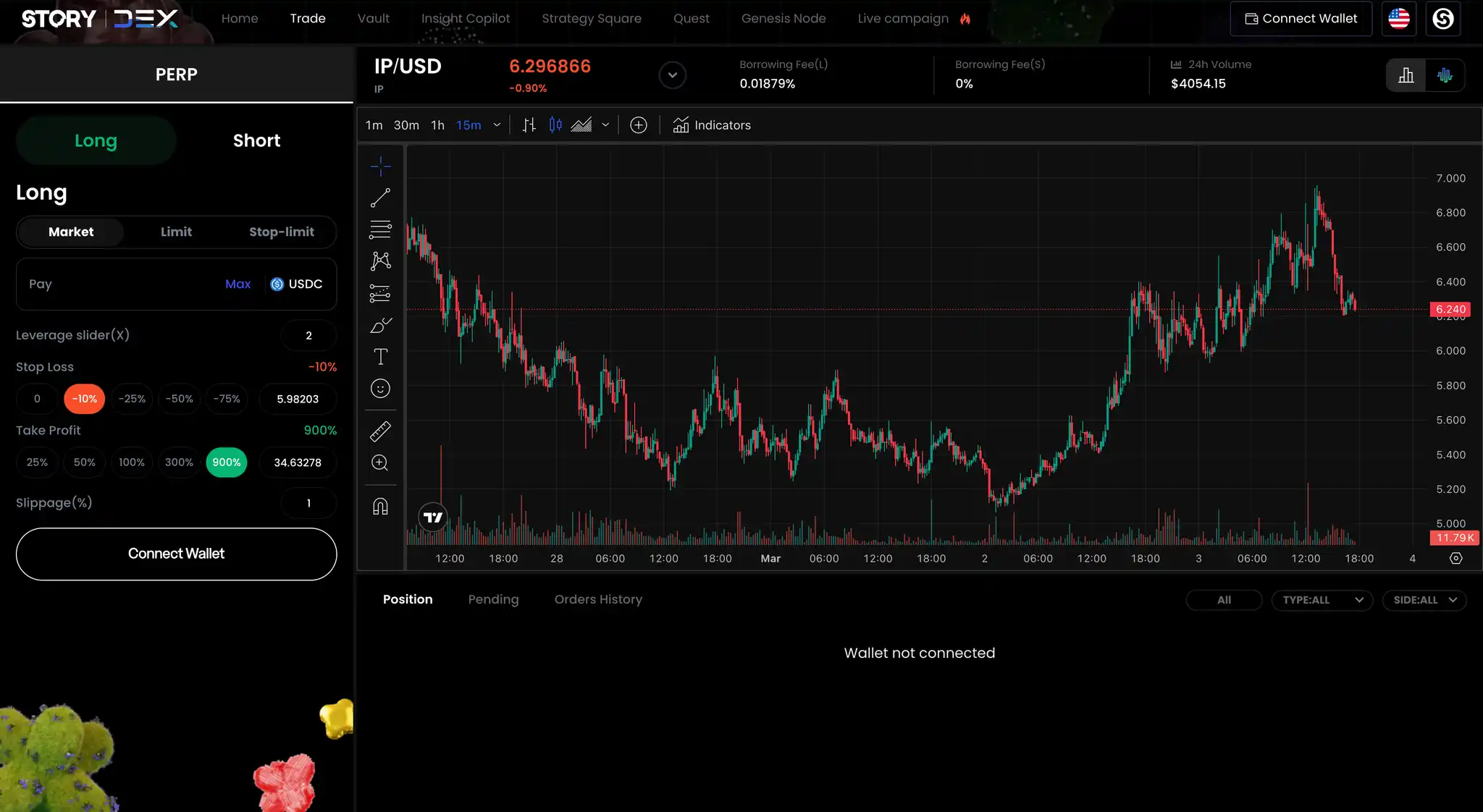 提供了以 Story 链上的 USDC 为保证金的杠杆永续交易,交易对覆盖广。