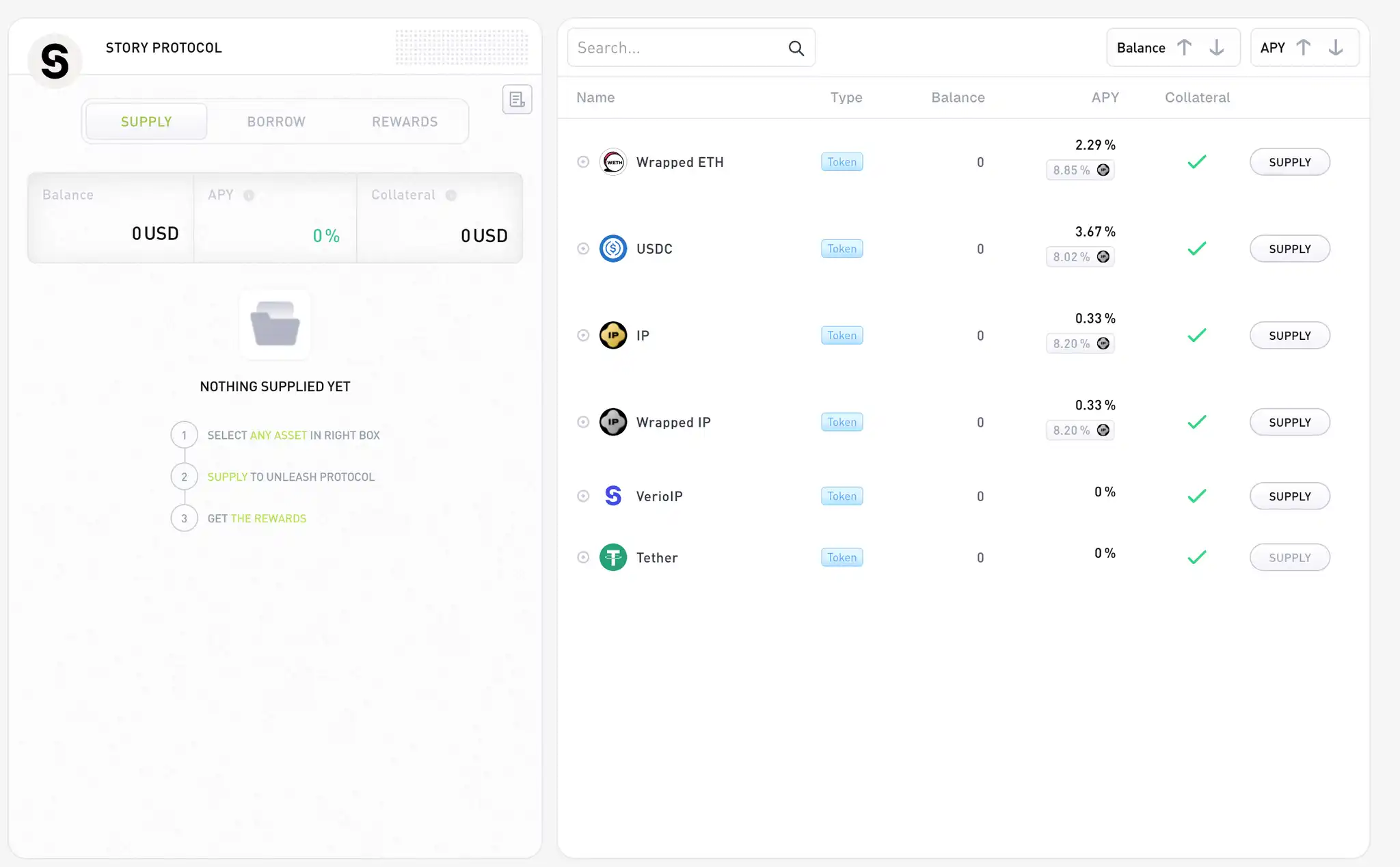 Unleash Protocol 是分叉自 AAVE V3,它是第一个撬动了 IP 的初始杠杆的借贷协议。现有的借贷品类相对简单,包括 WETH,USDC,IP 等三种资产。目前 Story Foundation 还推出了 Unleash Protocol 的流动性激励计划,通过借贷可以获得 WIP 作为奖励年化的部分。