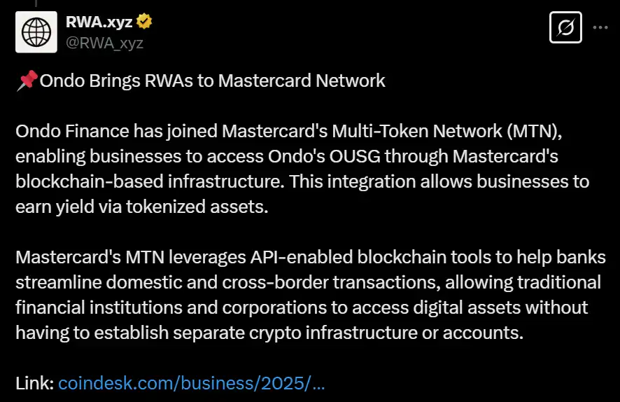 ONDO Finance 直接把 RWA 搬进了万事达卡的生态,它已经加入 万事达卡的多代币网络(MTN),让企业可以直接通过万事达卡的区块链基础设施访问 OUSG,也就是说,传统金融机构甚至不用摸加密钱包,就能靠代币化资产赚收益。
