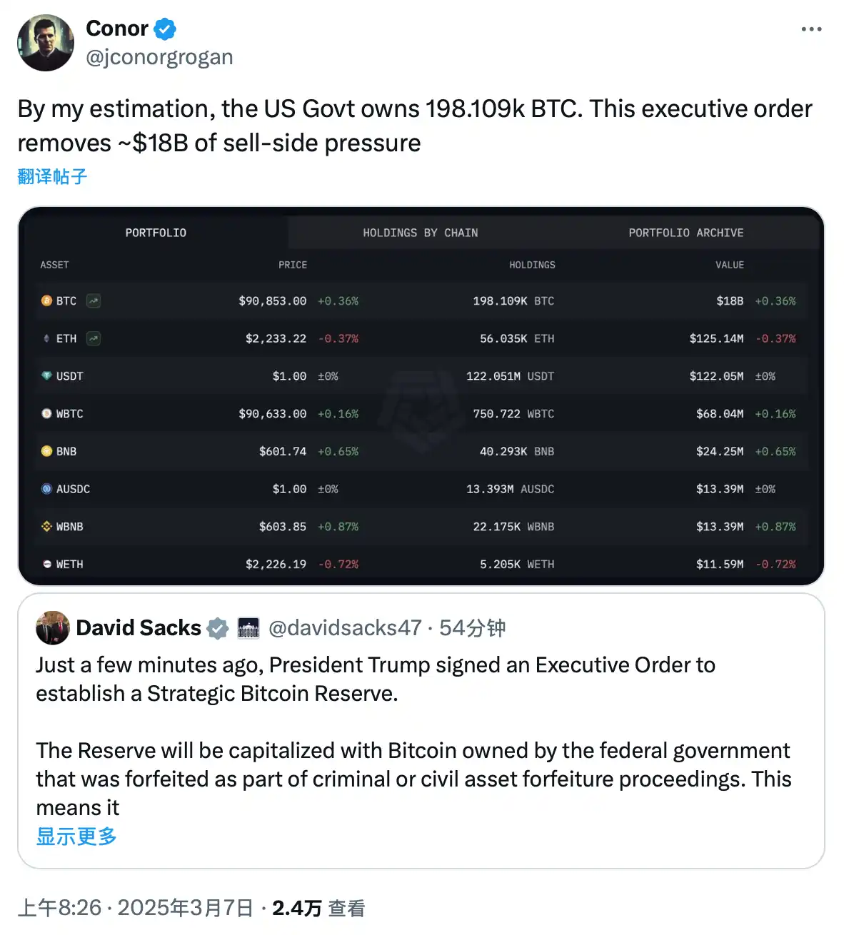 白宫 AI 与加密货币主管 David Sacks 在社交媒体发文表示,「此前美国政府过早出售比特币已经让美国纳税人损失了超过 170 亿美元。现在,联邦政府将制定一项策略,以最大限度地提升其持有的比特币的价值」。Coinbase 主管 Conor Grogan 则在社交媒体上发文表示,「据我估算,美国政府持有 198,109 枚比特币。这项行政命令将减少约 180 亿美元的抛售压力。