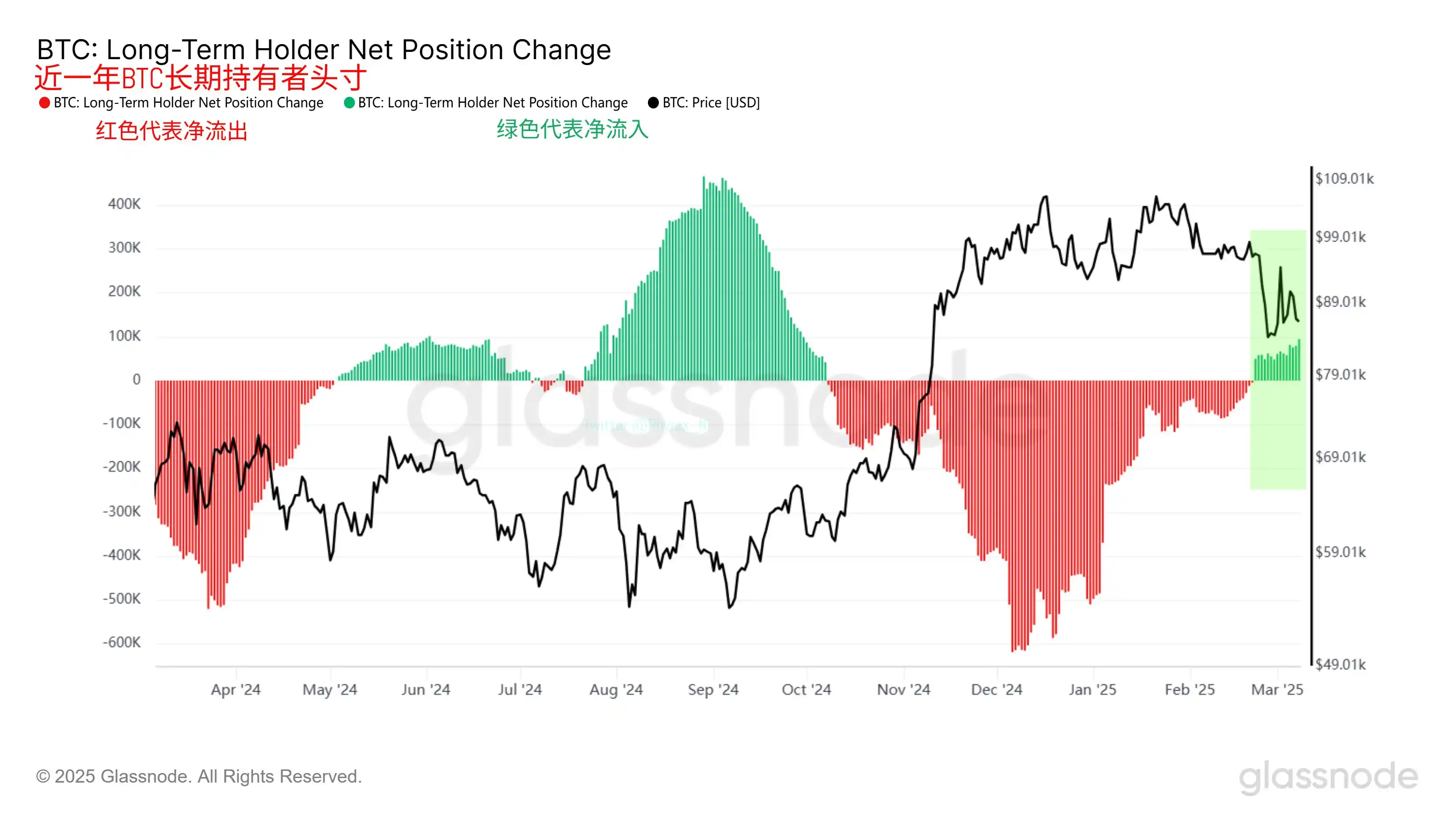 链上数据为市场提供了一线希望。根据 Glassnode 的分析,长期持有者(持仓超过一年的投资者)的行为正在发生转变,从派发阶段转向积累阶段。截至 3 月 9 日,长期持有者的净持仓变化(Net Position Change)转为正值,日均流入约 5000 枚比特币。历史上,这一趋势的转变往往是市场从顶部转向底部的可靠信号,例如 2019 年初和 2020 年 3 月的底部形成期。