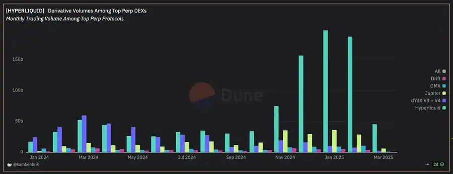 截至 2024 年 2 月,Hyperliquid 已占据 链上衍生品 DEX 交易量的 56%。自 2024 年 7 月 起,其 月度永续合约交易量 超越主要竞争对手。2025 年 1 月,Hyperliquid 单月永续交易量达到 1960 亿美元,而 其他四大协议总和仅为 600 亿美元。