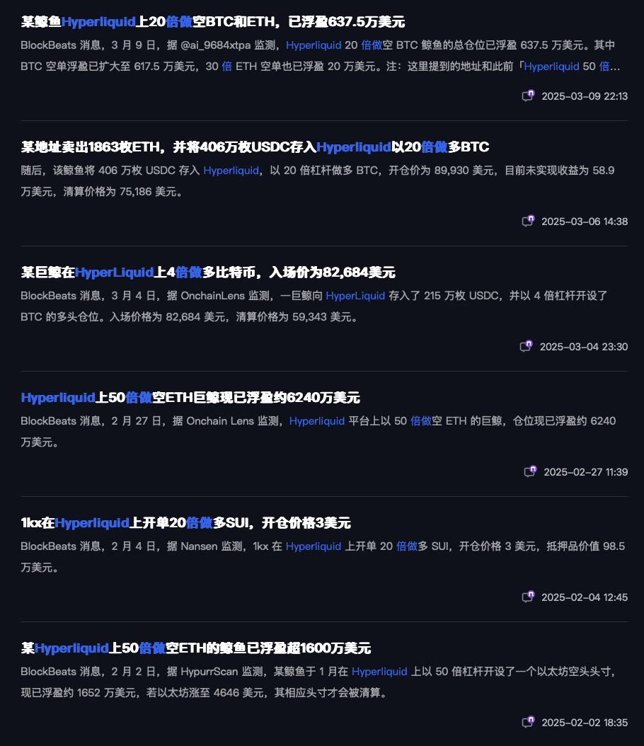 编者按:为何巨鲸们热衷于 Hyperliquid,这家去中心化衍生品平台以高达 50 倍杠杆、零 Gas 费和全链上透明订单簿,成为高风险交易者的天堂。近期据 blockbeat 快讯消息,多位巨鲸在特朗普宣布战略加密储备后开高倍杠杆的多空单,净赚数百万美元。平台低成本、高杠杆特性,叠加市场剧烈波动,让巨鲸们趋之若鹜,Hyperliquid 也因此成为合约交易的新焦点。