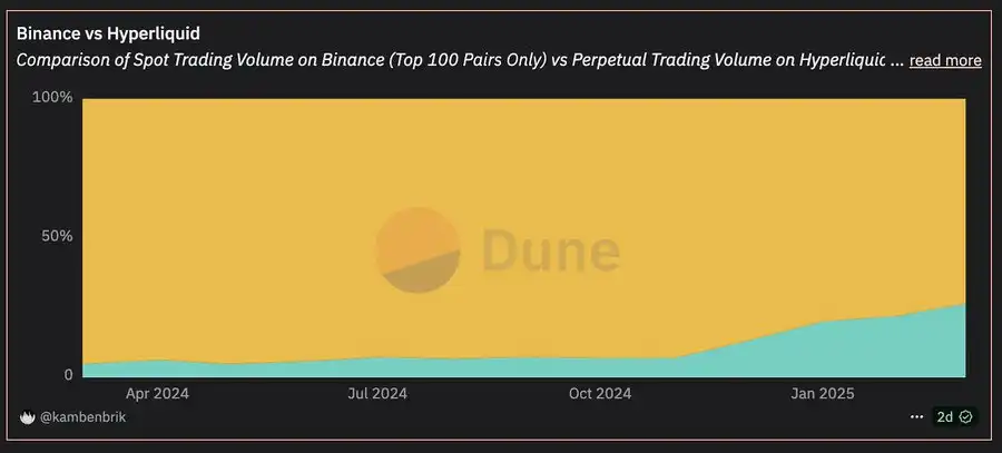 ·尽管 Hyperliquid 仍然小于像 Binance 这样的顶级 CEX,但它在某些月份缩小了差距,到了 2025 年 3 月,它的交易量占比超过了展示的总交易量的 26%(与 Binance 前 100 的现货交易对相比)。这一比较强调了一个链上高性能的永续合约交易所能够有效挑战甚至是主导的中心化现货市场。
