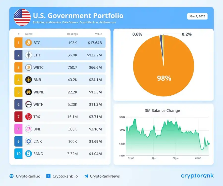 对美国政府加密资产组合的分析表明,某些山寨币可能会被纳入数字资产储备,其中可能的资产包括$ETH、$BNB、$TRX、$UNI、$LINK 和$SAND