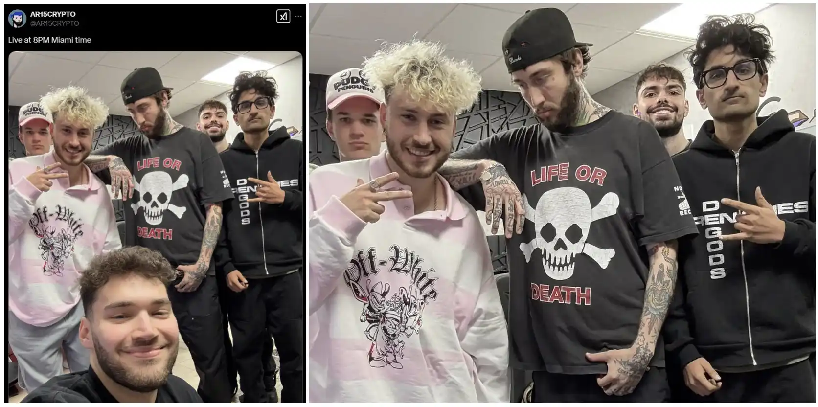 骂声纷至沓来,有人甚至传「LA Vape Cabal」和朝鲜黑客组织 Lazarus Group 有关联,就连 threadguy 他们和 Adin Ross 采访时拍的合照,也将 Ross P 掉后在社区流传这是一个只靠内幕交易操纵 meme 市场的阴谋集团。