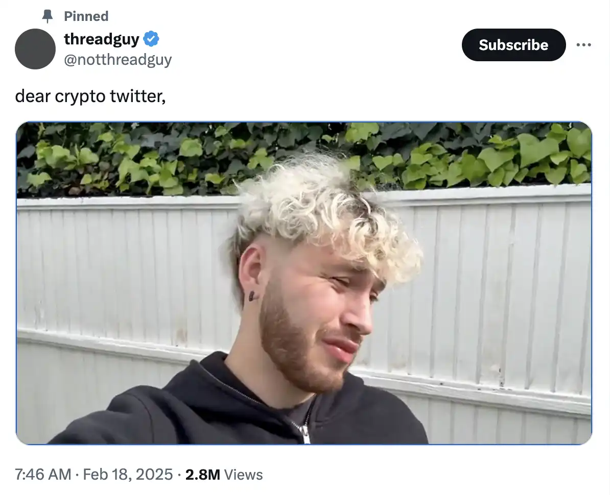 LIBRA「跑路」后的第四天,threadguy 在 X 上发布了一条十分钟澄清视频。除了澄清自己在阿根廷币上没有内幕消息并且没有任何事实性证据表示他有内幕提前交易之外,threadguy 还说了一段出乎意料的话: