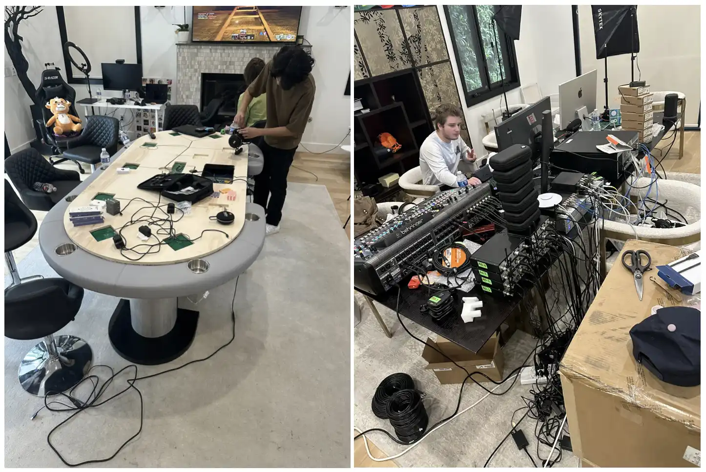 时间回到三个月前,10 月底,Polymarket 赞助了一场扑克之夜活动,发起人正是 threadguy,而举办地点是 threadguy 和其团队在这所房子里花了 26 个小时搭建出来的专用牌桌。复杂的直播设备、房间的一角还能看到 threadguy 之前直播的桌子和电脑。