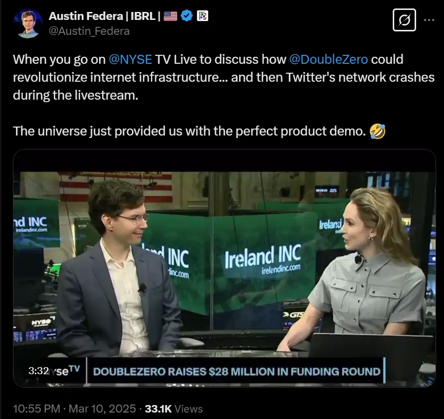 就在昨天,DoubleZero 的创始人 Austin Federa 上了纽约证券交易所(NYSE)TV 直播,聊 Double Zero 如何革新互联网基础设施,结果 Twitter 在直播过程中宕机了。