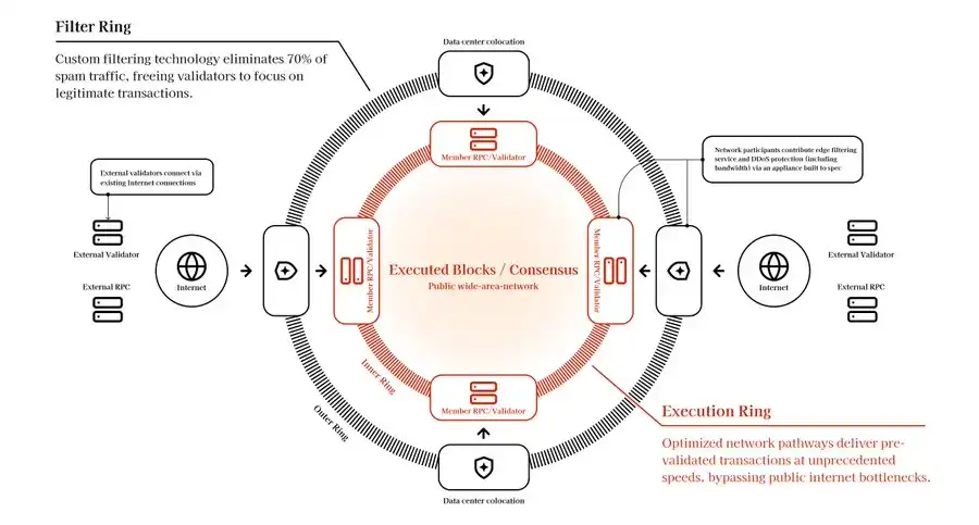 Double Zero 的核心技术亮点在于其独特的双环架构(Two-Ring Architecture),Outer Ring(外环)连接公共互联网,使用硬件(如 FPGA)进行攻击防护、签名验证和交易过滤,Inner Ring(内环)则通过专用带宽线路处理这些过滤后的流量,并进行共识构建。