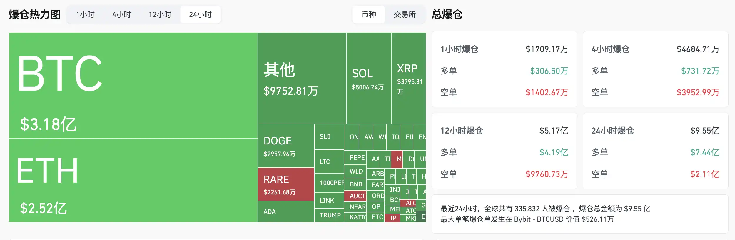 衍生品数据方面,Coinglass 数据显示,过去 24 小时全网爆仓 9.55 亿美元,其中绝大部分为多单爆仓,数额达 7.44 亿美元。从币种来看,其中 BTC 爆仓 3.18 亿美元,ETH 爆仓 2.52 亿美元。
