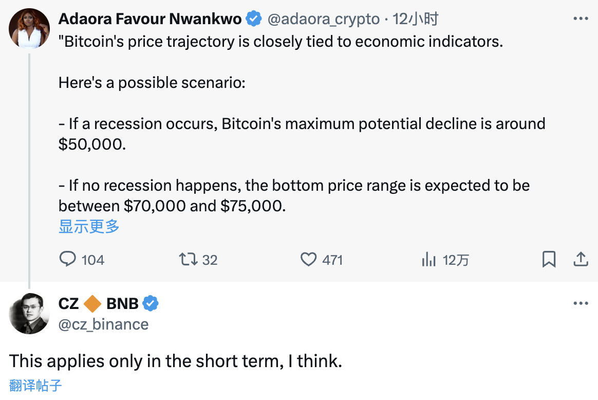 市场的悲观情绪并未因此缓解。股市的悲观情绪叠加美国经济衰退的担忧,有社区成员认为在这样的环境中,比特币的最大潜在跌幅约为 50,000 美元。对此,CZ 表示:「宏观经济指标对比特币价格的影响仅适用于短期。」言外之意,大概还是要坚持长期主义,坚持 HODL。