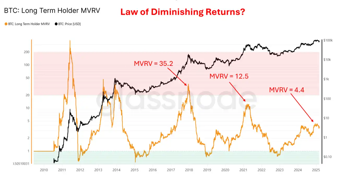 比特币的长期持有者 MVRV(比特币的「聪明钱」)在去年 12 月达到 4.4 的峰值。这仅为 2021 年周期峰值 12.5 的 35%,而 2021 年周期峰值又是 2017 年周期峰值的 35%。