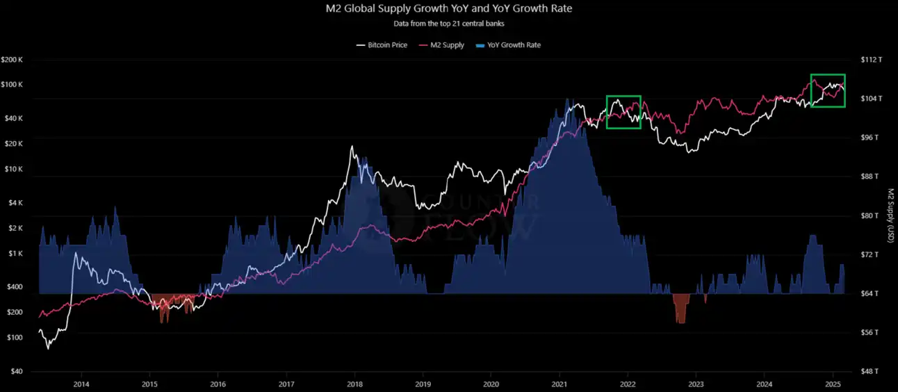 自 1 月中旬以来,全球 M2 增长了 1.87%,主要原因是各国央行从紧缩政策转向宽松政策。