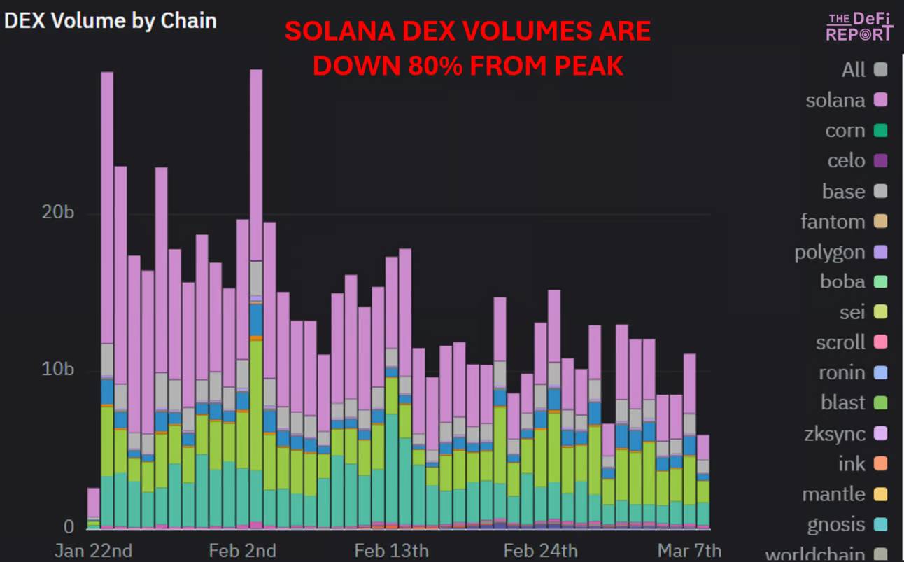 Solana 去中心化交易平台的交易量相比于特朗普推出其 Memecoin 后达到的峰值,已经下降了 80%。与此同时,活跃的独立交易者数量也下降了超过 50%。这向我们表明,市场的投机热情正在减弱。