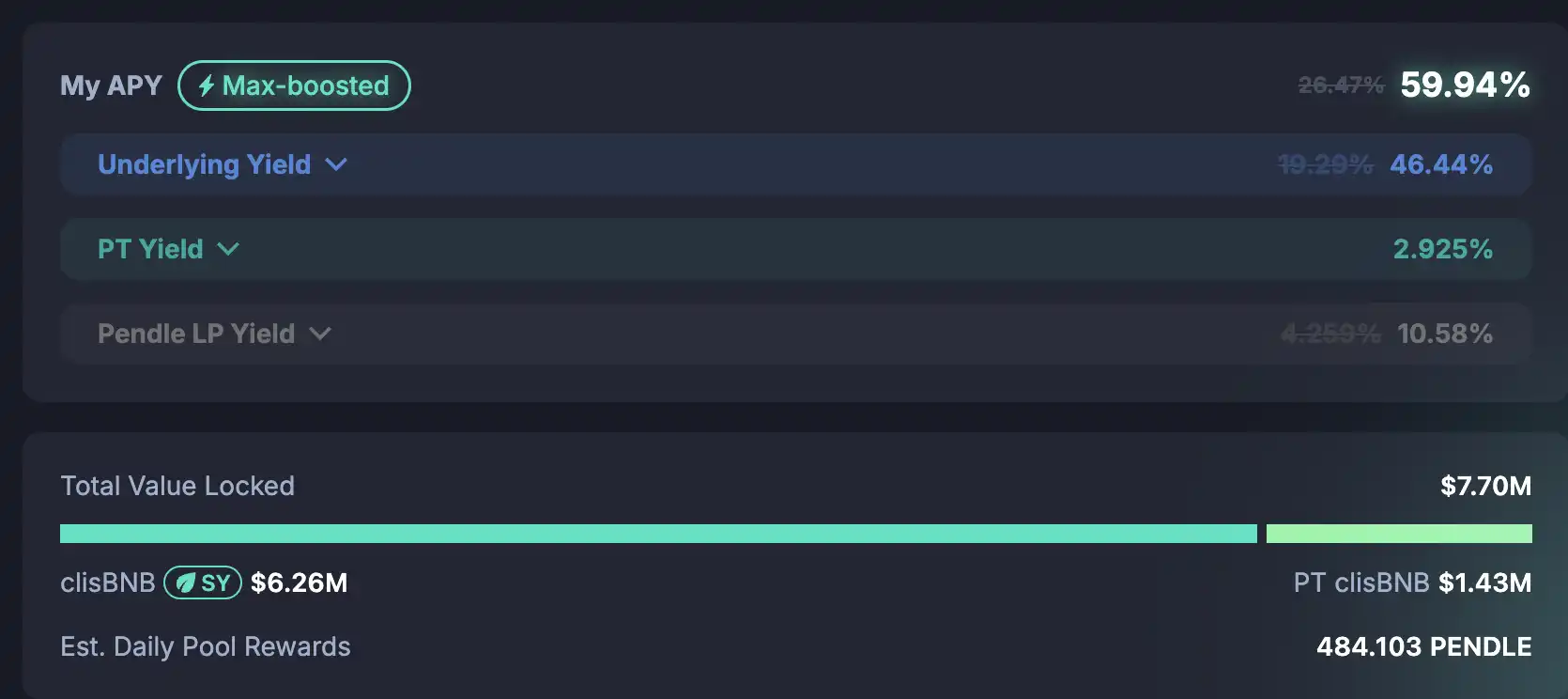 Pendle 本就是让资产收益最大化的 DeFi 工具,而与 BNB 生态中将 BNB 收益做到极致的 Lista DAO 合作,无疑是 BNB 持有者的又一次收益 Boost。两者合作期间,slisBNB 可以在 Pendle 上被铸造成 clisBNB,然后将 clisBNB 拆分成 PT(本金代币)和 YT(收益代币),如此一来持有 slisBNB 的用户,在 Pendle 上可以最大化自己的 BNB 收益。
