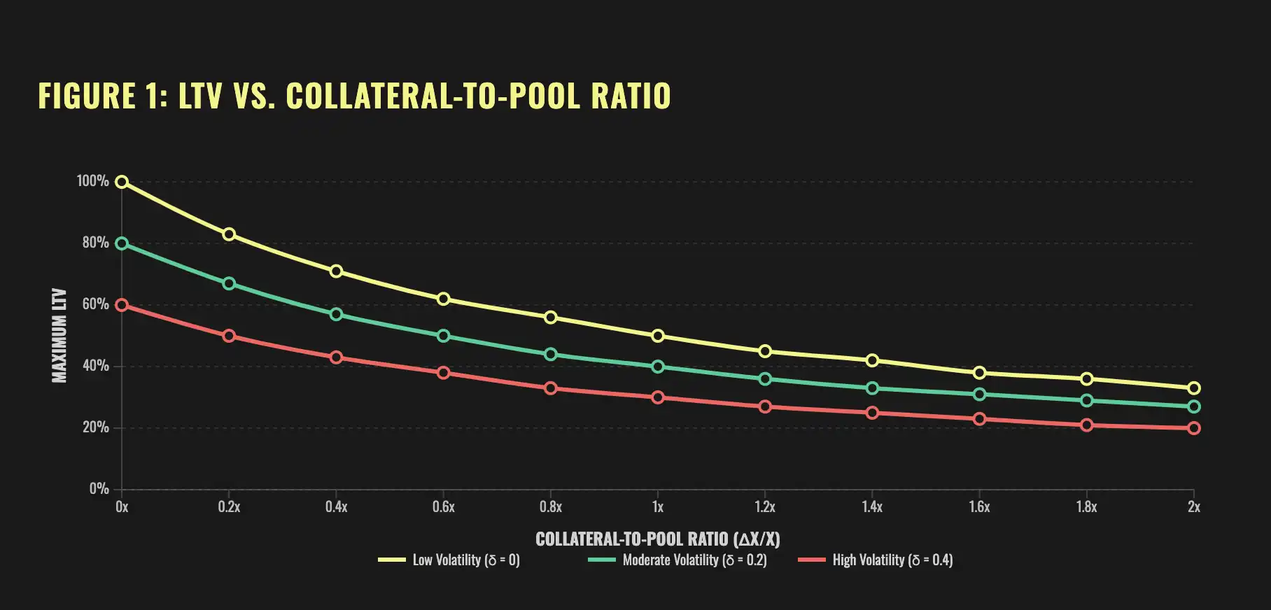 LTV 是指抵押一种代币后,最多能借出多少其他代币的比例。一般在传统的 DeFi,平台会简单地判定某种代币风险等级。比如判定风险程度中等,就只能借到抵押价值的 70%。这种固定比例忽略了两个重要因素,「市场深度」和「实时波动性」,前者在借款金额过大的情况下,会大幅影响代币价格,而后者在市场不确定性高时会产生巨大的清算风险。