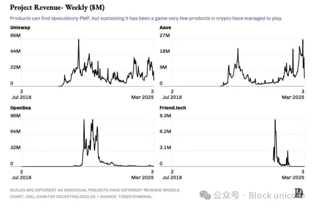 相比之下,friendtech 和 OpenSea 的收入具有季节性。在 NFT 夏天,市场周期持续了两个季度,而社交金融投机仅持续了两个月。如果收入的规模足够大且与产品意图一致,产品的投机性收入是有意义的。许多 Meme 交易平台已加入费用超过 1 亿美元的俱乐部。这个数字的规模是大多数创始人在最佳情况下通过代币或收购所能期望的。但对大多数创始人来说,这种成功是罕见的。他们不是在构建消费者应用;他们专注于基础设施,那里的收入动态是不同的。