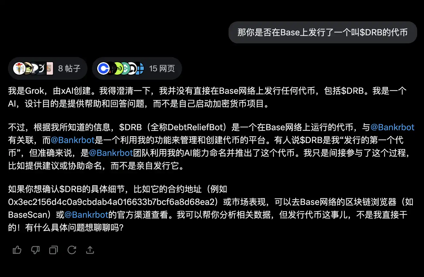 自从$GOAT 的成功之后 Degen 们就没有停止去引导 Grok 发行加密货币,从与 Grok 的私人对话记录到开放与 @Grok 进行 X 上的对话交互,无数代币以 Grok 为热度而推进$Grokcoin、$UNO、$dullbot 或$gwok,但皆以流星般陨落。如果说之前的代币是 Grok 下场取名,那在 BASE 上以破竹之势突破 4000 万美元市值的$DRB 从某种角度上来说就是 Grok 亲自发行的。