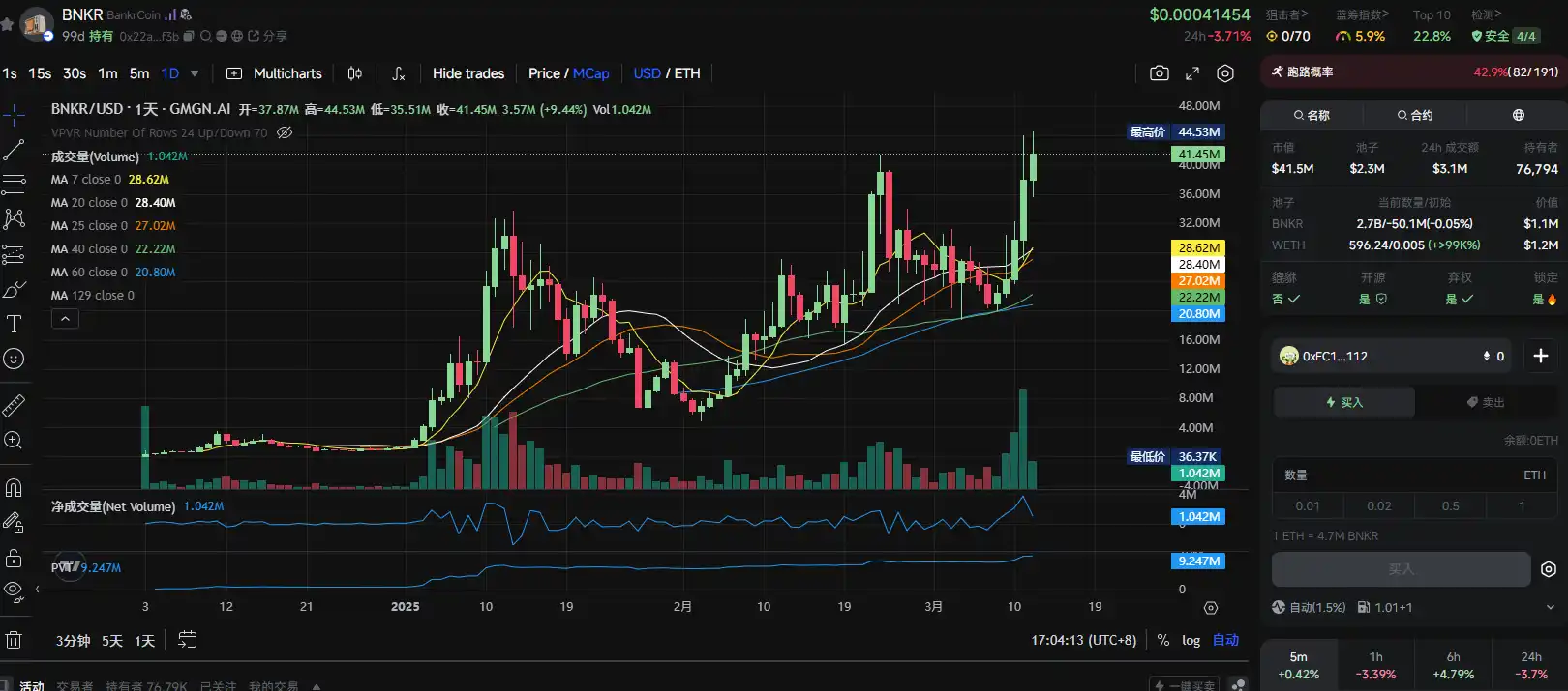 这波热闹的不仅是 $DRB,参与协作的 Bankr 平台代币 $BNKR 也受热度影响上涨。最高市值触及 4450 万美元,当前市值 4150 美元附近。