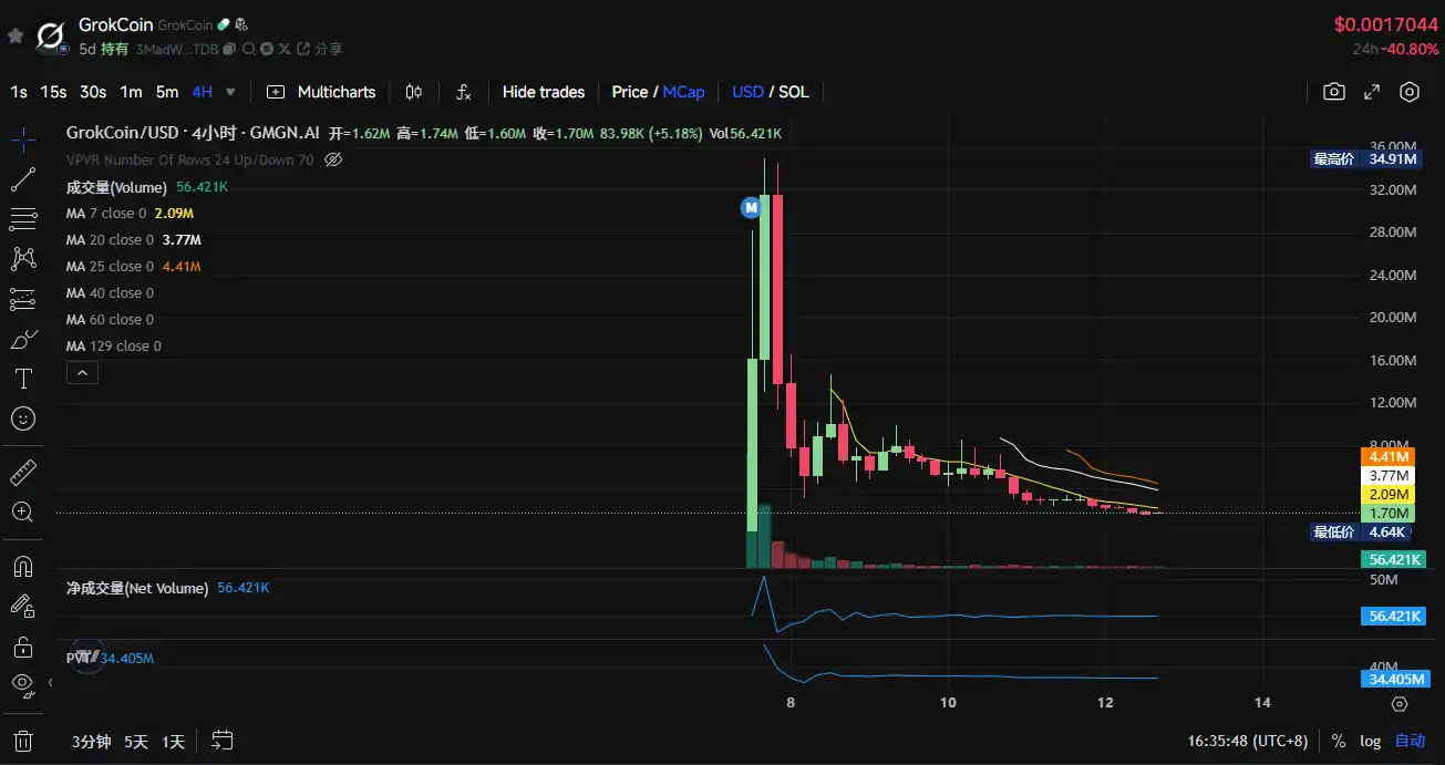 这一「商机」自然被加密玩家们捕捉,于是不断有人在推特上想方设法引导 Grok 提及属于自己的 Meme 币这回事。最一开始,Grok 确实在 Solana 上带起一波相关热点 Meme 发生在 Solana 上,相关代币 $GrokCoin 最高市值接近 3500 万美元,但这个叙事没有足够的后劲支撑,经过今天的 PvP 后币价逐渐走向归零。
