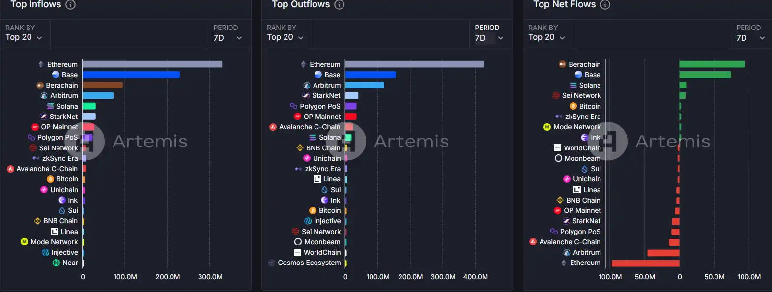 各链主币表现惨淡,链上行情自然也一般。据 Artemis 数据,近一周内各链资金净流量骤减,只有极个别链保持正向流入。其中除了以太主网与质押热度持续的 Berachain,资金流动量最大的就是 Base 链。