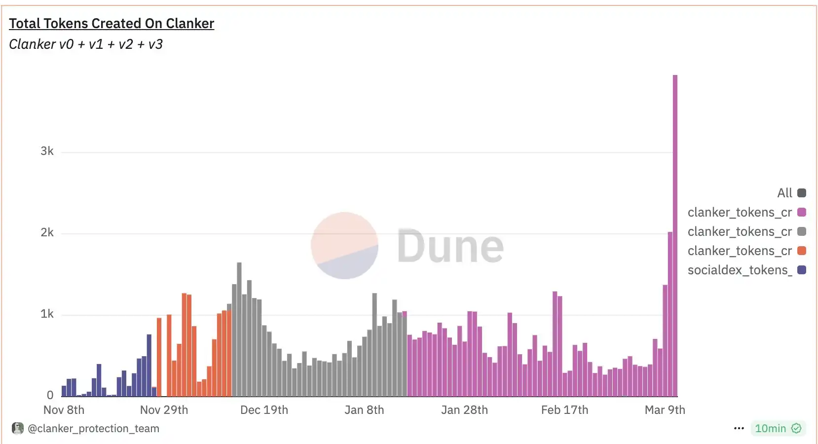这波由 Grok 和 BANKR 带来的流量也让 Clanker 平台这几天的代币部署量飙升: