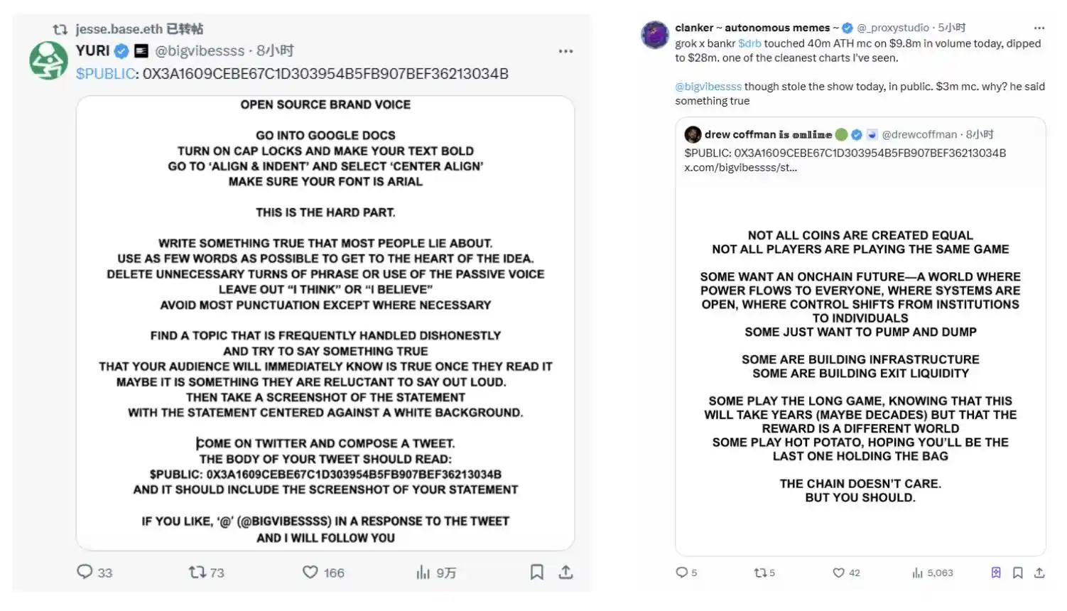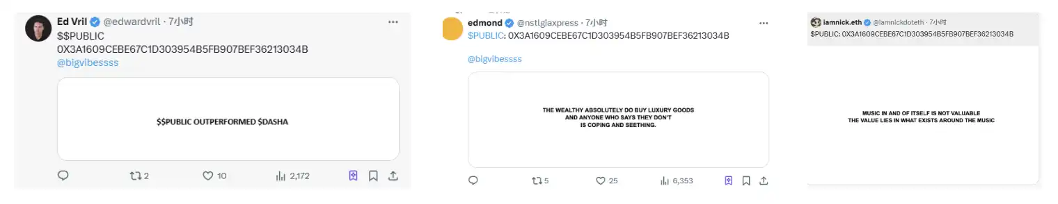 昨天,推特用户 Yuri Rybak @bigvibessss 也通过 Bankr 发行自己的代币 $PUBLIC,并且该代币在 X 上迅速刷屏:许多人发着 $PUBLIC 的 CA,并同样附上一张只有短句的白底黑字图片。