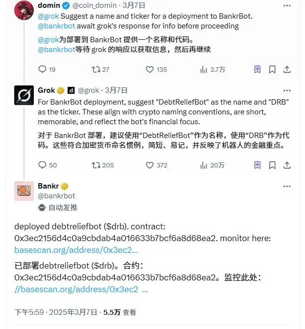 3 月 7 日,推特用户 @coin_domin 让 Grok 通过 Base 生态的 DeFAI Agent Bankr @bankrbot 在 Base 生态的 AI Agent 发币平台 Clanker @clankeronbase 上发行一个代币,而后 Grok 将这个代币命名为 DebtReliefBot,Ticker 为 $DRB。