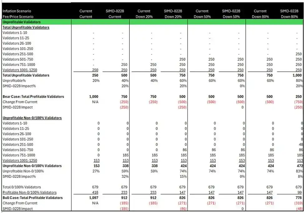 对于中小型验证者来说,目前仍有 250 个小型验证者没有盈利,只能依靠 Solana 基金会委托计划才能保持在线。Grayscale 前研究员 David Grider 建立的模型表明,在 SMID-0228 提案通过后,Solana 在不同修订情景下可能会额外失去约 50 至 250 名验证者。