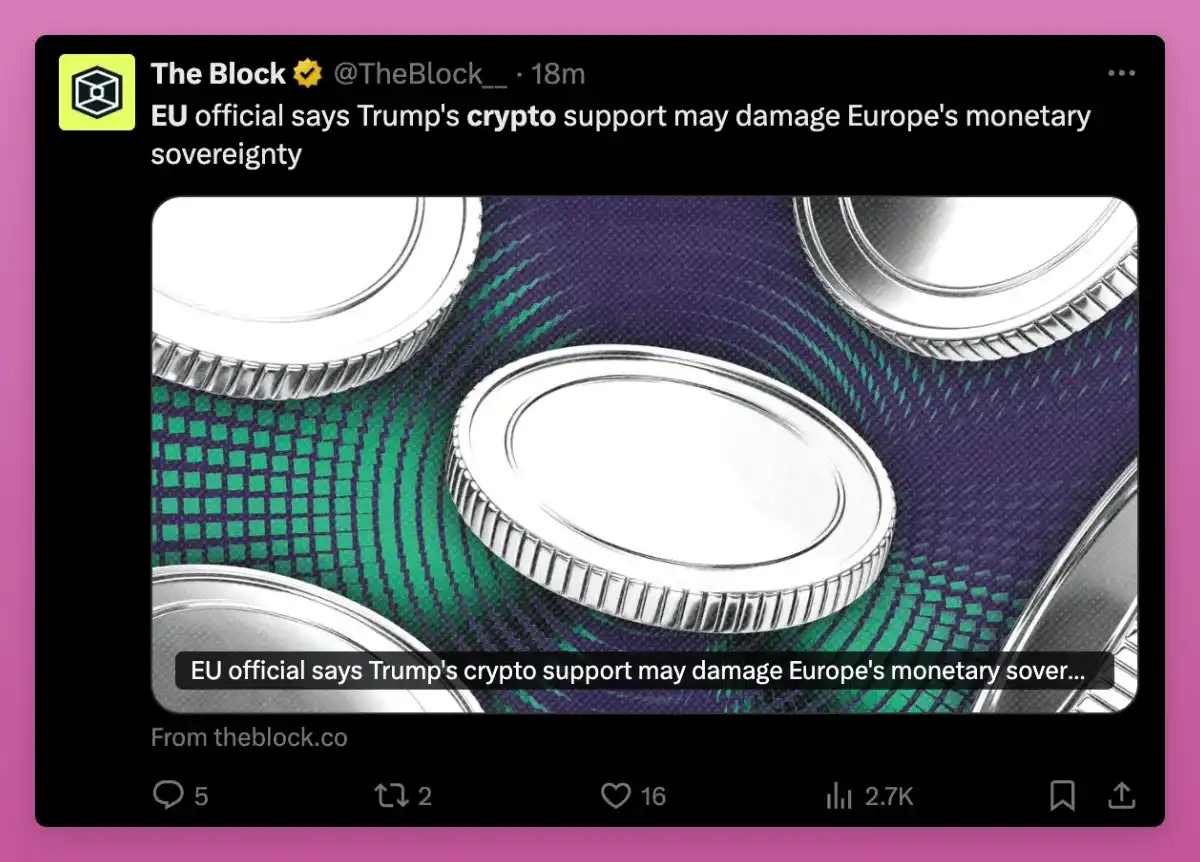 此外,由于特朗普的公开拥护,人们现在将加密货币与 MAGA 运动联系在一起,而这一运动在其圈子之外并不受欢迎。毫不意外,欧盟认为特朗普对加密货币的支持是对欧洲货币主权的威胁。