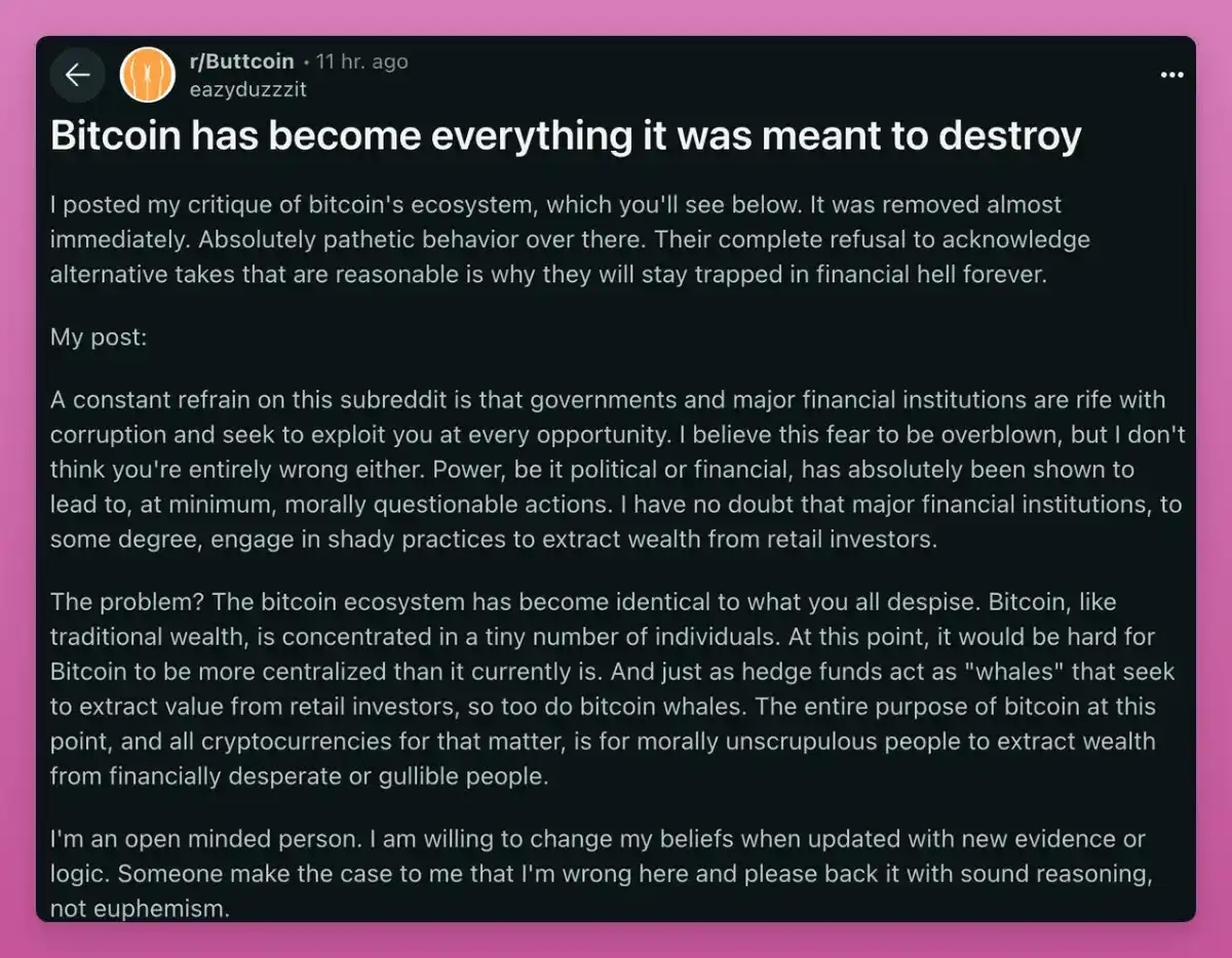 更糟的是,公众不再将加密货币视为改善金融系统的革命性方式。正如下文所述:「比特币生态系统已经变得和你所鄙视的一切一模一样。」金钱和权力集中在少数人手中,从经济上绝望的人那里榨取财富。