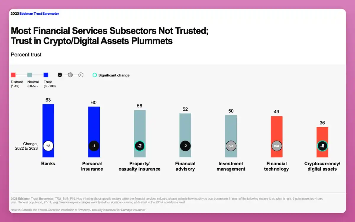 在 Edelman 2023 年全球调查中,加密货币在每个年龄段都被不信任,它的信任度甚至低于我们试图革新的银行。