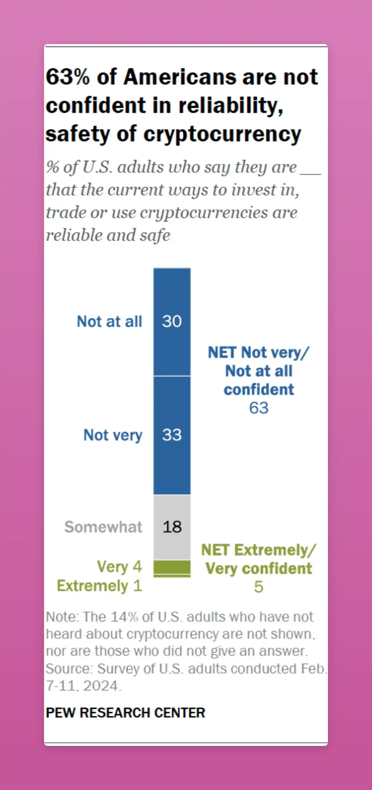 2024 年皮尤调查发现,75% 的美国人不信任其可靠性和安全性,因为诈骗和市场波动。