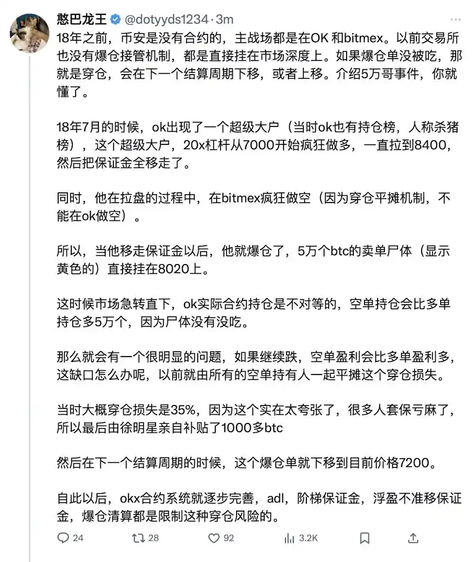根据 KOL 憨巴龙王的推文,2018 年 OK 交易平台曾发生类似事件。使用了同样的手法,盈利后撤出保证金使得市场达到爆仓价没有对手盘能够消化造成交易平台买单的事件。