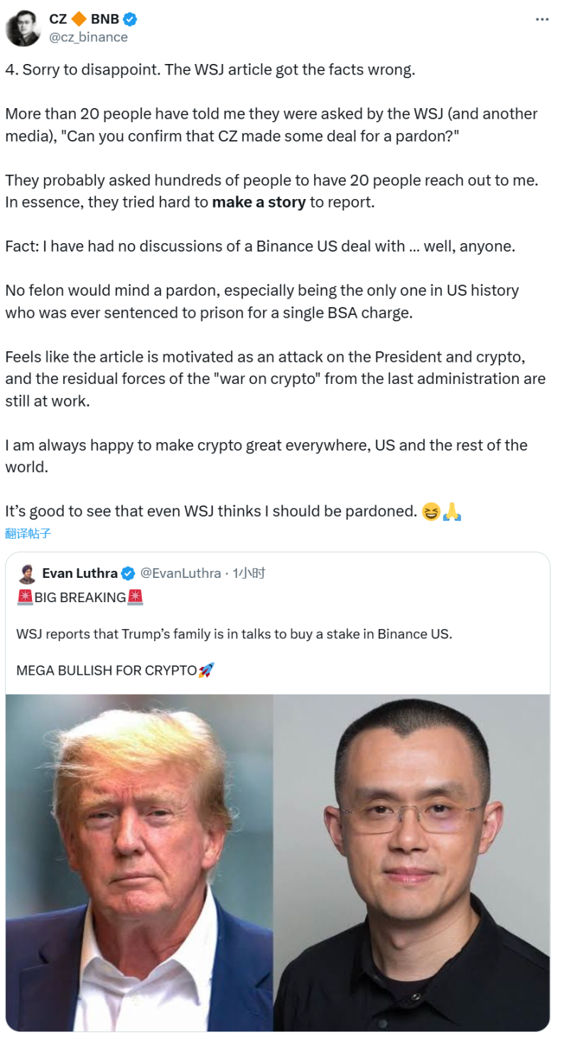 赵长鹏表示,「事实是:我从未与任何人讨论过 Binance US 的任何交易。任何被定罪的人都不会介意获得赦免,尤其是作为美国历史上唯一因单一《银行保密法》(BSA) 指控而被判入狱的人。这篇文章似乎是有意攻击总统和加密行业,而上届政府打压加密货币战争的残余势力仍在发挥作用。我始终愿意让加密行业在美国及全球范围内变得更强大。很高兴看到连《华尔街日报》都认为我应该被赦免。」