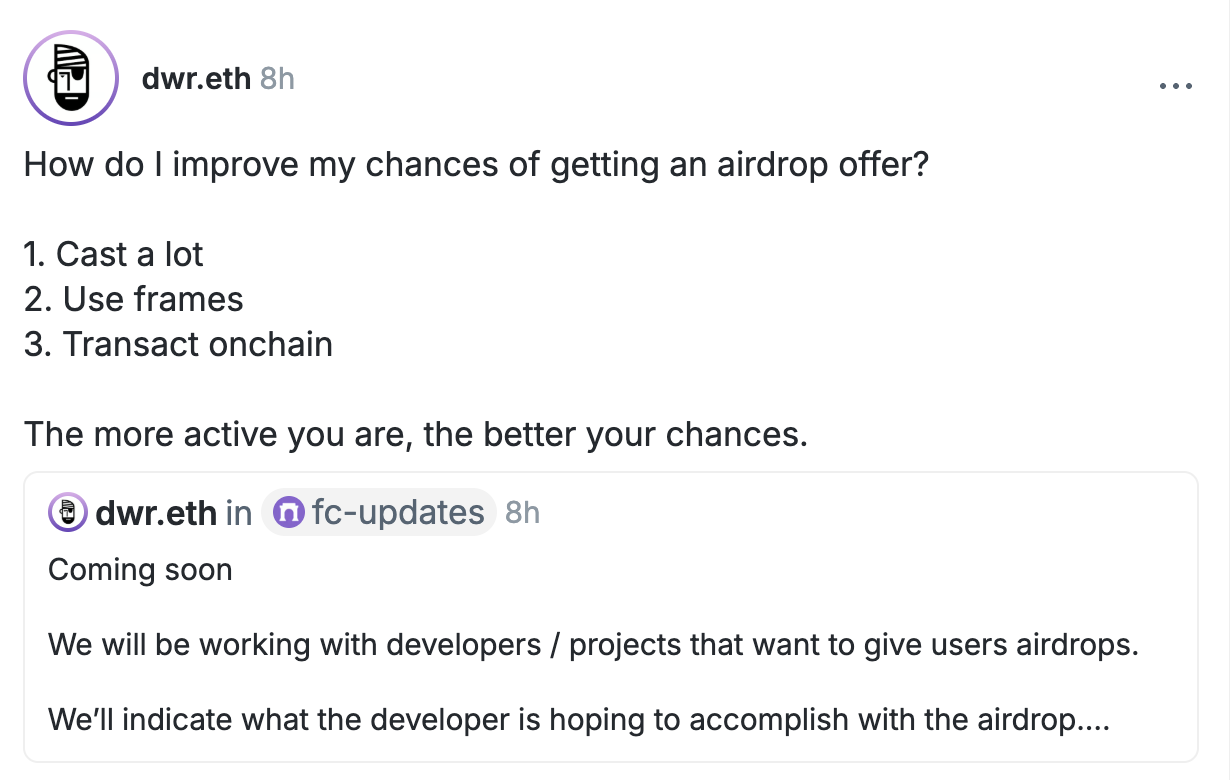 最终,开发者可以自由决定目标用户,因为相关数据是无需许可的。创始人 dwr 表示,未来的 Farcaster 空投将更倾向于奖励那些实际使用产品并与开发者目标一致的用户。