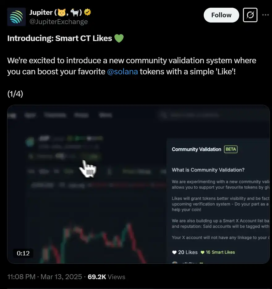 Jupiter 作为 Solana 生态的 DEX 聚合器,昨天官方也是推出了新花样,引入了代币点赞功能,用户可以通过点赞表达对某个代币或交易对的「表白」认可,既能表达自己的态度,还能顺手给市场扔个社交信号,告诉大家:「嘿兄弟们,这币有点意思。