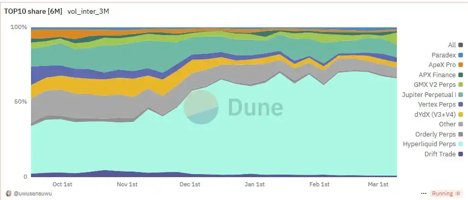 Hyperliquid 已被证明是唯一能够在交易量和未平仓合约上与中心化交易所竞争的永续合约 DEX,并在市场份额上完全碾压其他同类 DEX。这种主导地位主要归因于以下几个原因:
