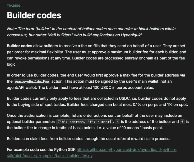 Builder Codes 允许项目零成本使用 Hyperliquid 的基础设施和流动性。可以类比 Web2 领域,它们的作用类似于 AWS 之于计算资源,但这里是为流动性提供支持。