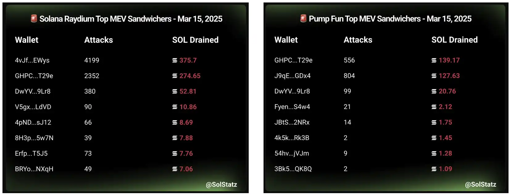 针对这些现象,加密分析师 @PepeBoost888指出,近期部分 Jito 验证者存在泄露数据给夹子的情况,导致防夹交易的数据被夹子提前获取。根据 @solstatz 统计,仅 3 月 15 日,Raydium 报告 10633 次攻击,共计流失 916.63 SOL;Pump Fun 报告 1770 次攻击,共计流失 314.85 SOL。