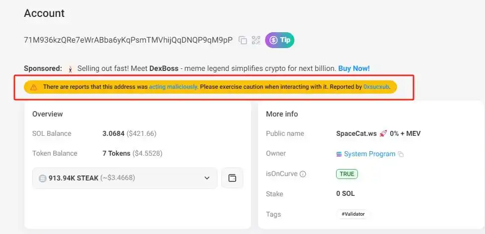 加密分析师 @PepeBoost888 提示,要判断自己的交易是否被恶意验证者打包导致遭受三明治攻击,可以通过以下方式核查:首先在 Solscan 区块链浏览器中点击对应交易的区块编号,进入区块详情页面后找到"Leader"字段,查看负责打包该区块的验证者节点信息。目前部分作恶验证者已被社区举报并在 Solscan 平台标注了风险提示,用户也可将验证者地址与 @0xsucxub 维护的公开作恶节点列表进行交叉比对以确认风险。