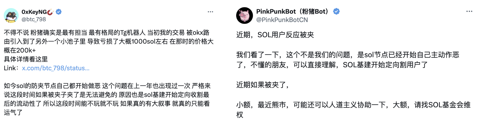 GMGN 联创 @haze0x 也专门发帖提醒大家:「SOL 链上的 MEV 设施出现了问题,夹子开始猖狂了。」