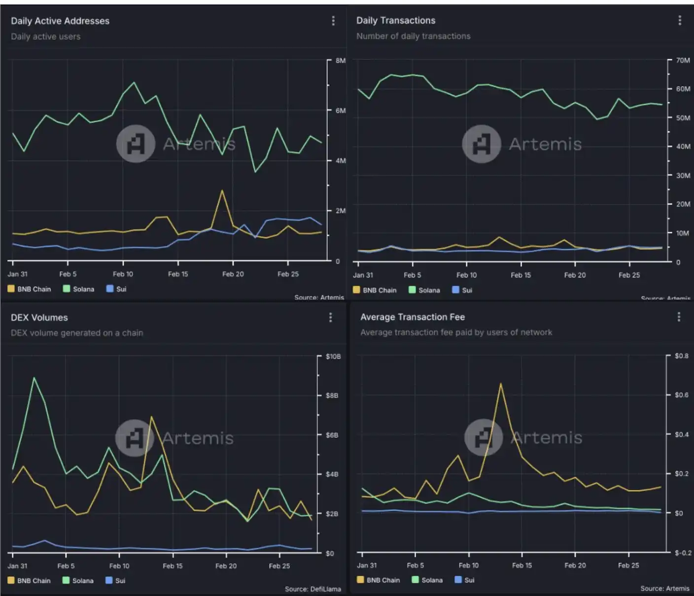 - BSC 的 TVL 从 2 月初 5.5 billion 下降到 4.7 billion,下降了 14%。其他链的 TVL 从 112 billion 到 82 billion,下降了 26%。