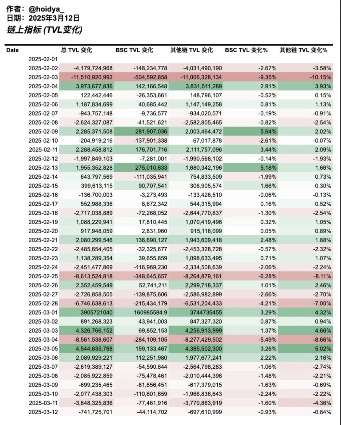 - 期间 BSC 的 TVL 变化随着总 TVL 变化,但明显发现 2 月 9 日以及 2 月 13 日在这段期间内流入金额比其他时间要高。而其他链主要是在 2 月 4 日、3 月 1、3 月 3 和 3 月 5 比较高;BSC 流出金额较高的时间与其他链相似。(看% 变化)