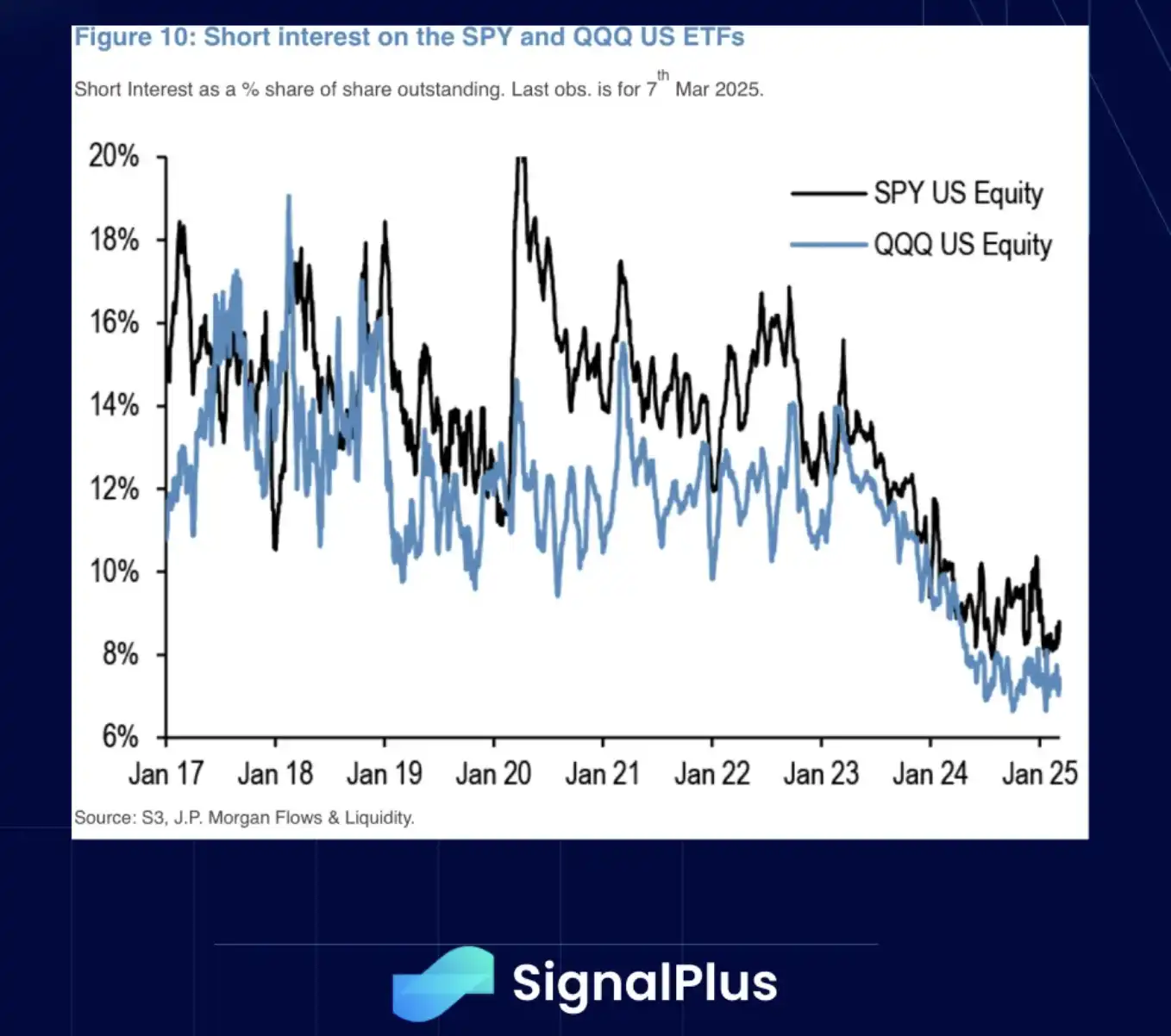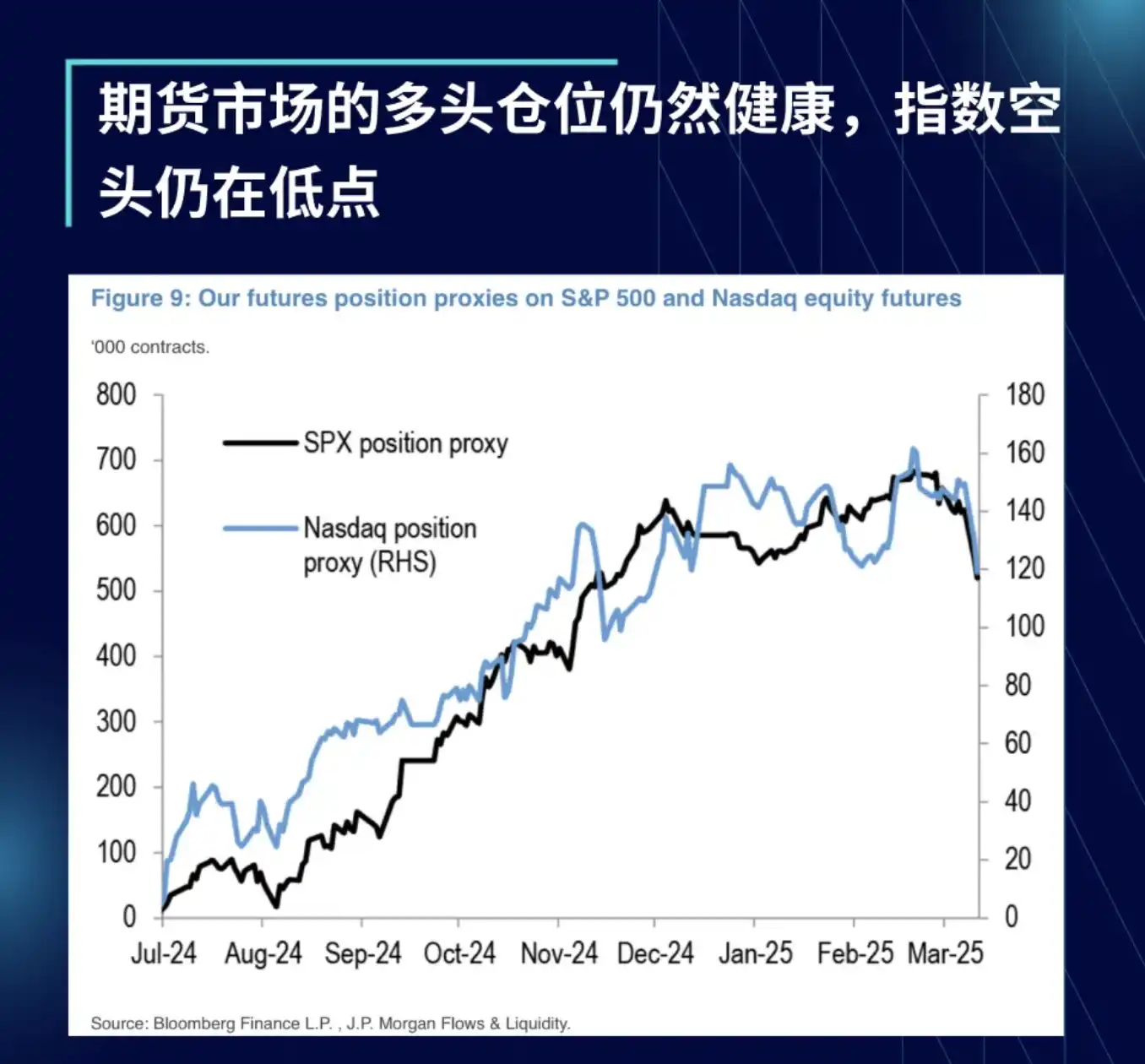 与此同时,期货多头仓位虽有所回落,但相较历史水平仍然偏高。此外,SPX 和 Nasdaq 的空头仓位仍在低点,表明市场仍缺乏做空力量。