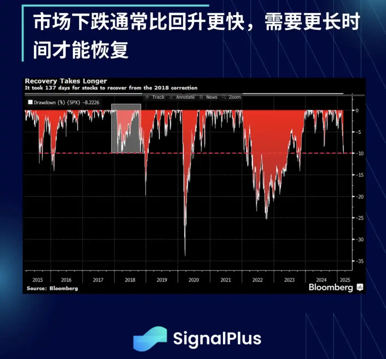 相比之下,市场的复苏往往需要更长的时间,因为当代基金经理受到严格的风险控制约束。2018 年 SPX 下跌 10% 仅用了两周,但花了将近 4.5 个月才完全收复损失。Bloomberg 指出,在过去 24 次市场下跌超过 10% 的情况中,平均恢复时间约为 8 个月,反映出市场通常「慢涨急跌」。