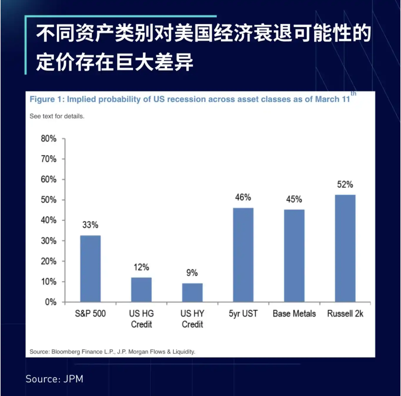 根据摩根大通的数据,过去 12 次美国经济衰退中,美国股市从高点到低点的平均跌幅约为 30%,而目前 SPX 的调整幅度仅为 9.5%。简单的推算表明,股市目前隐含的经济衰退可能性为 33% 左右,大宗商品与美债市场隐含的可能性则接近 50%,而信贷市场隐含的衰退可能性仅为 10%。